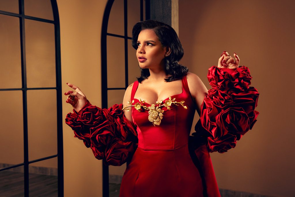 La comunicadora brilló en la antesala de Premios Soberano con una creación en color rojo, de la destacada diseñadora Lucía Roque, que honra el Mes Internacional de la Mujer
